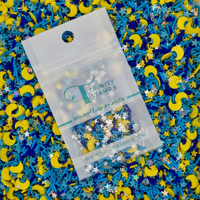 A blue mix of sprinkles accented with clay stars and yellow moons.