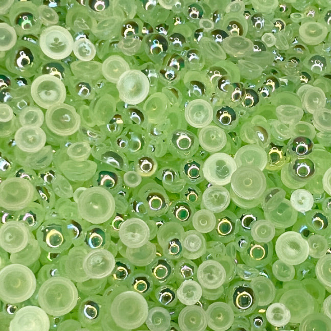 This bauble mix contains five sizes of flat-back transparent iridescent acrylic pearls (3mm,4mm,5mm, 6mm, & 8mm)