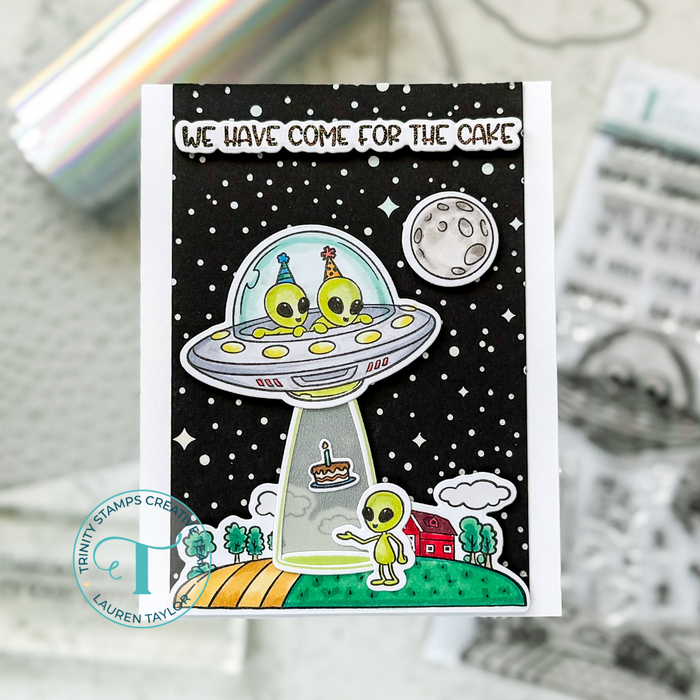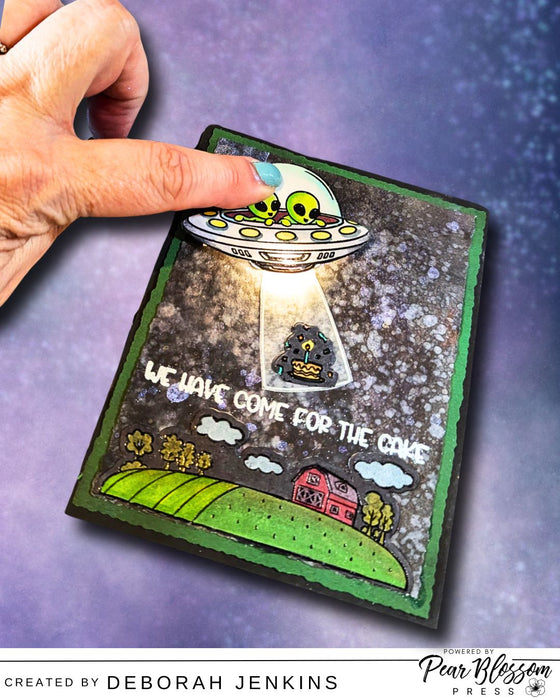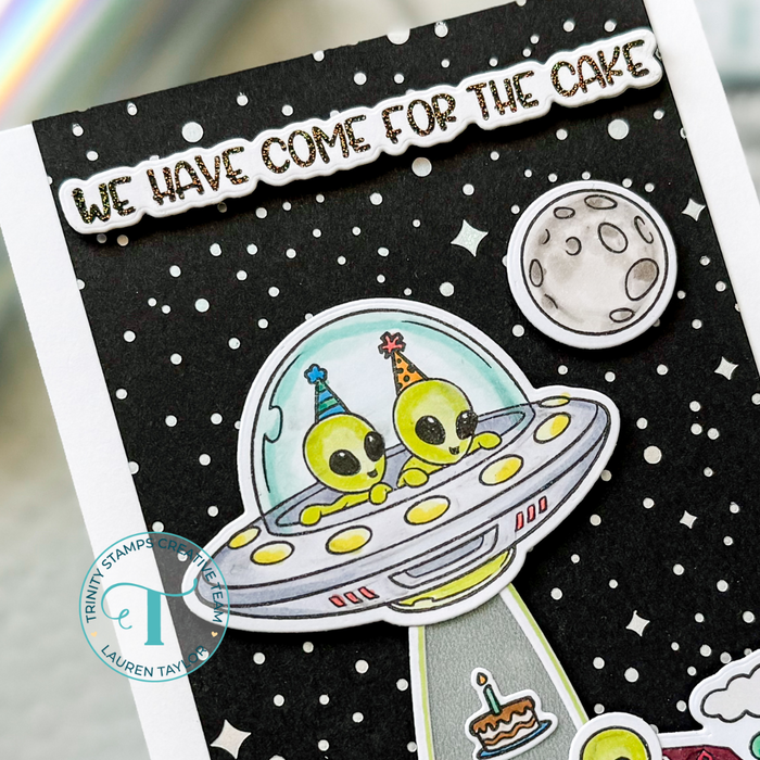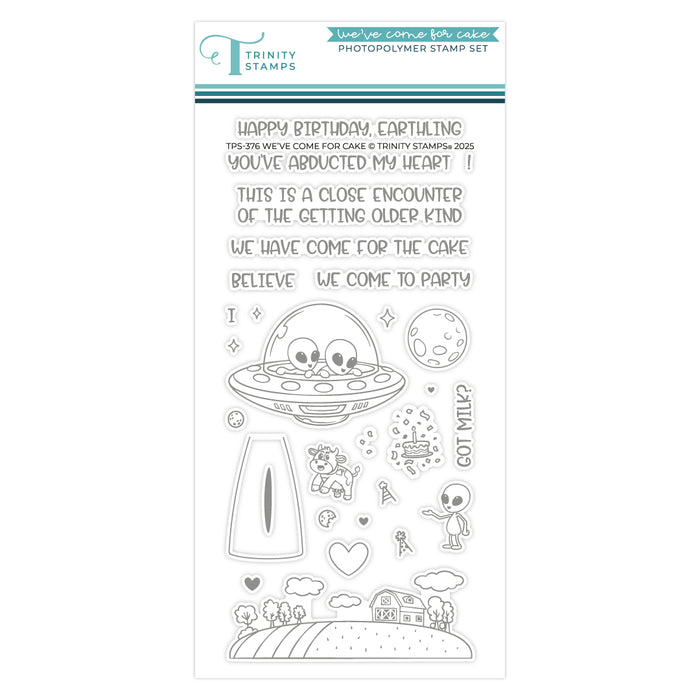 Need a stamp set that's out of this world? Check out "We've Come For Cake" - 29 pieces of pure extraterrestrial party fun! The UFO, measuring 2.6" wide, is sure to be the highlight of your crafting collection.